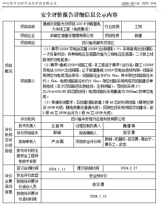 成都空港建设管理有限公司通威太阳能光伏项目220千伏配套电力专线工程(电缆敷设)安全预评价