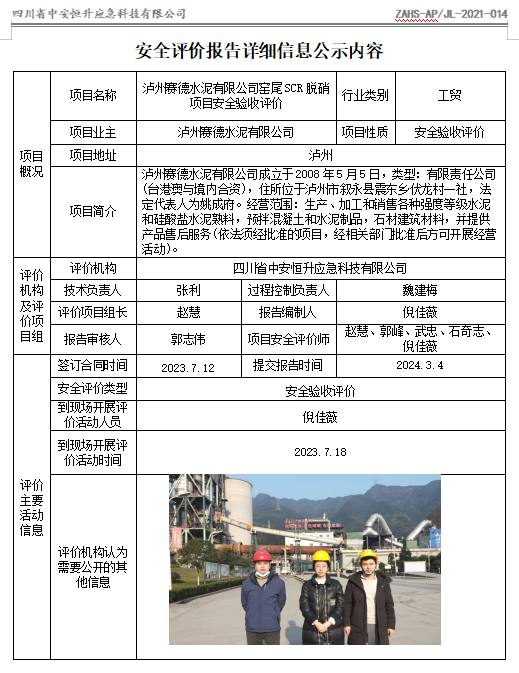 泸州赛德水泥有限公司窑尾SCR脱硝项目安全验收评价