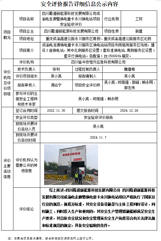 四川蜀道新能源科技发展有限公司成渝电走廊暨换电重卡永川换电站项目安全验收评价
