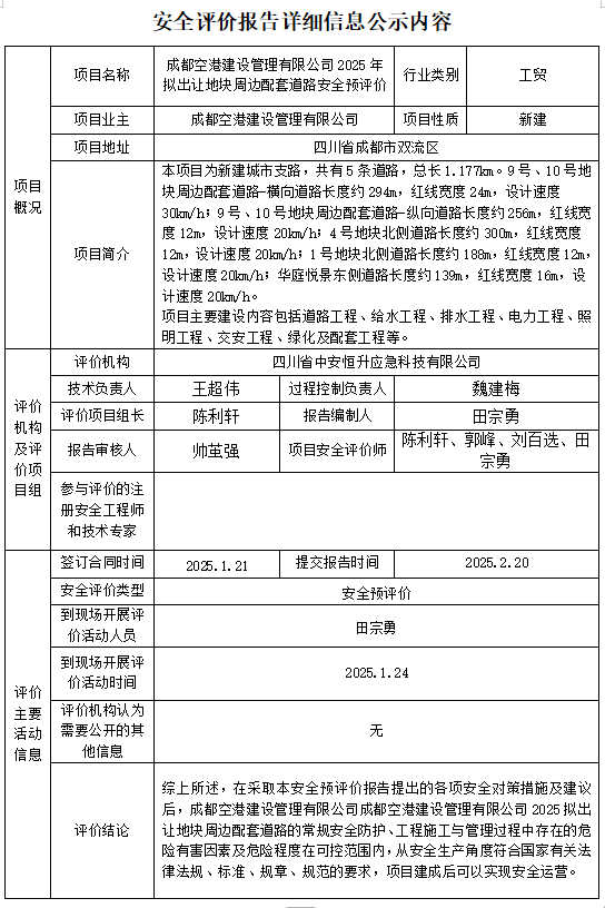 成都空港建设管理有限公司2025年拟出让地块周边配套道路安全预评价