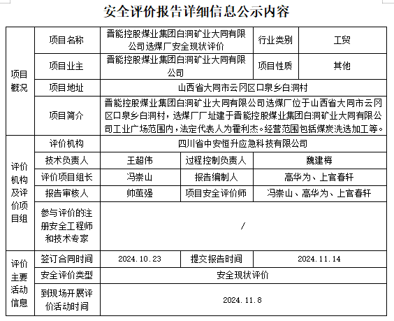 晋能控股煤业集团白洞矿业大同有限公司选煤厂安全现状评价