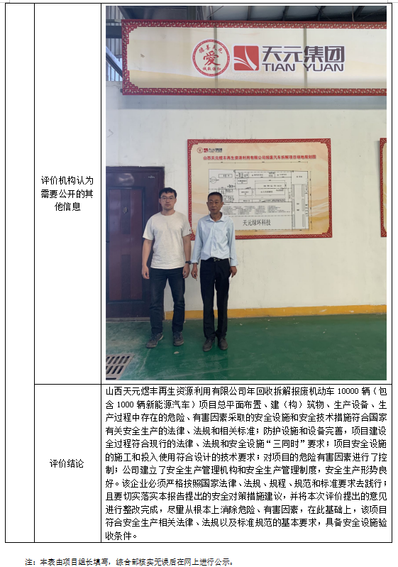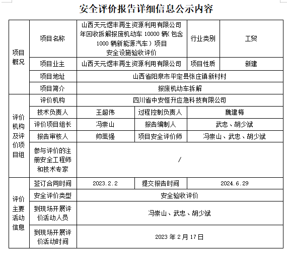 山西天元煜丰再生资源利用有限公司年回收拆解报废机动车10000辆(包含1000辆新能源汽车)项目安全设施验收评价