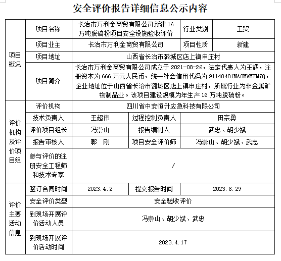 长治市万利金商贸有限公司新建16万吨脱硫粉项目安全设施验收评价
