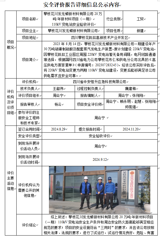 攀枝花川发龙蟒新材料有限公司20万吨/年新材料项目(一期)110kV变电站安全验收评价