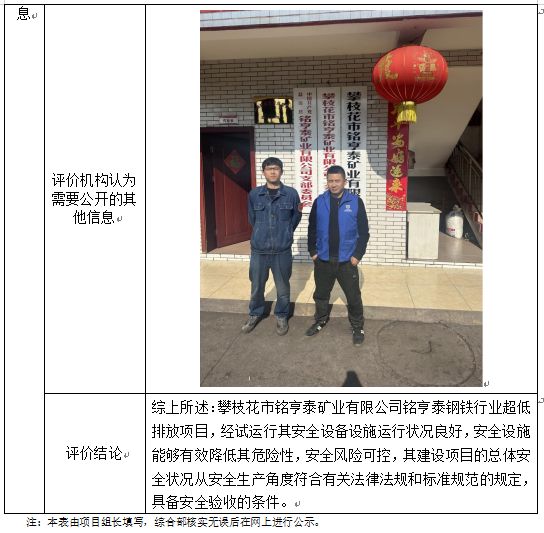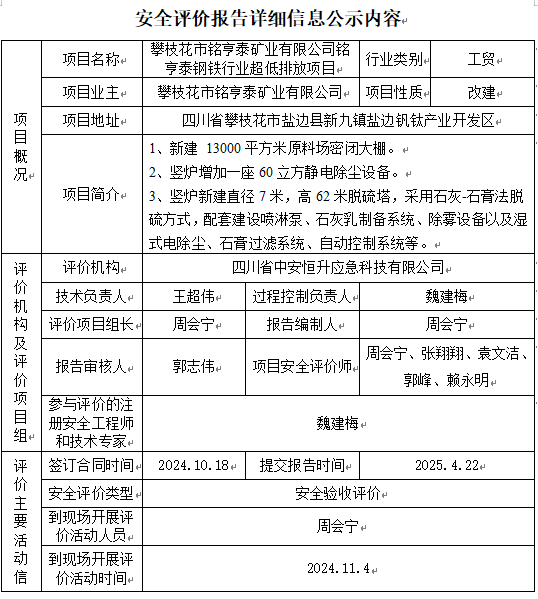 攀枝花市铭亨泰矿业有限公司铭亨泰钢铁行业超低排放项目安全验收评价