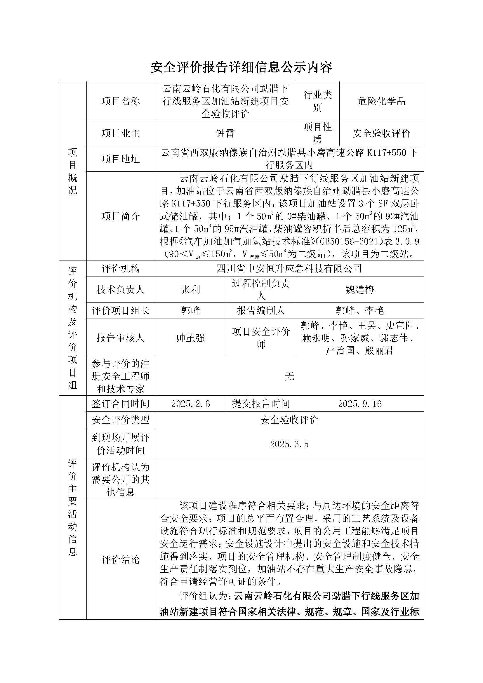 云南云岭石化有限公司勐腊下行线服务区加油站新建项目安全验收评价