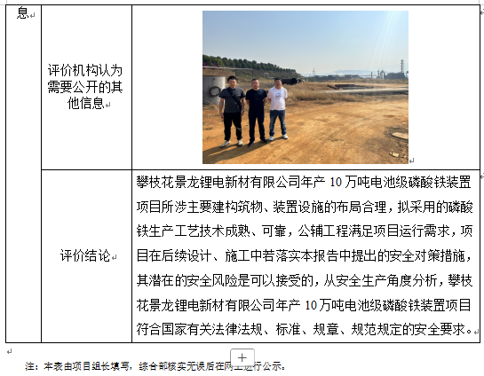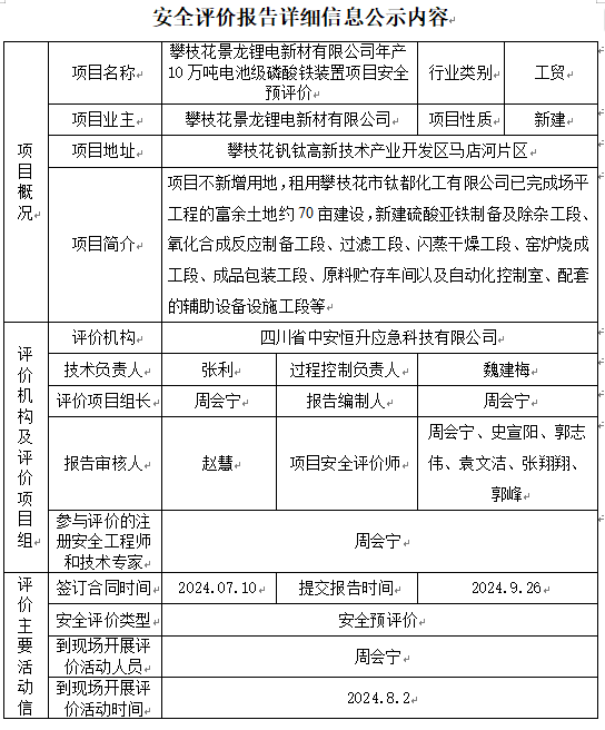 攀枝花景龙锂电新材有限公司年产10万吨电池级磷酸铁装置项目安全预评价